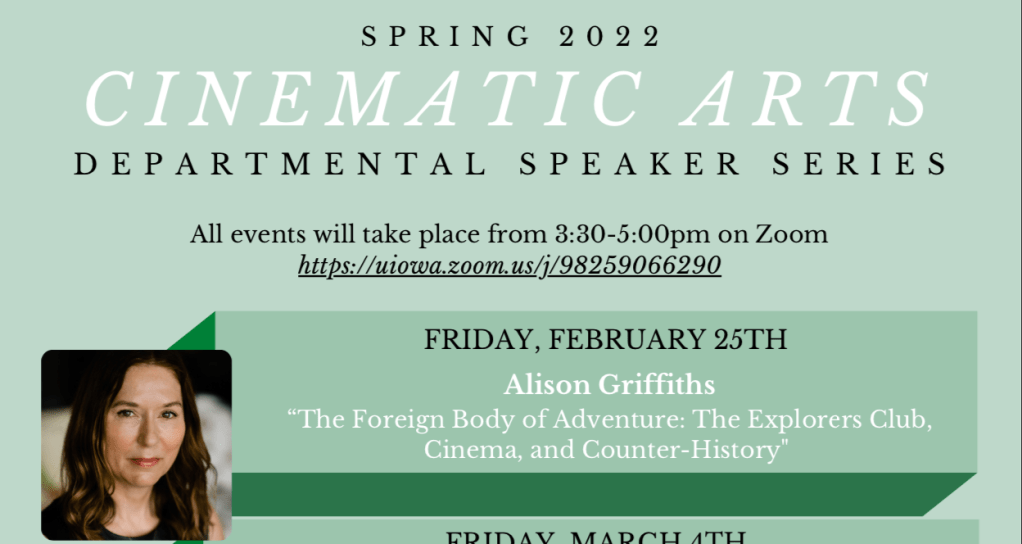 Spring 2022 Cinematic Arts Departmental Speaker Series, University of Iowa, February 25th from 3:30-5:00pm on Zoom. https://uiowa.zoom.us/j/98259066290